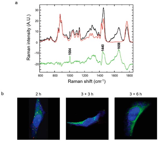 Imaging nanocarrier behavior over time. (a) The degradation of PLGA nanoparticles in macrophages over two weeks. Red spectrum shows pure, untreated PLGA, black spectrum shows PLGA after two weeks of degradation and the green spectrum shows the difference between the two. Reproduced with permission from [88], Copyright American Chemical Society, 2004. (b) PLGA nanoparticles incubated with HeLa cells showing proteins in blue, lipids in green, and nanoparticles in red. After 2 h of incubation with nanoparticles they were visible by Raman. After 3 h incubation with nanoparticles then 3 or 6 h of incubation with fresh media, nanoparticles were no longer visible. Reproduced with permission from [89], Copyright American Chemical Society, 2009.