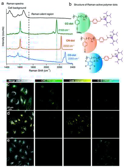 Analysis of Raman-active polymer dots using spontaneous Raman spectroscopy and SRS imaging. (a) Raman spectra of nanoparticles with orthogonal groups in the cell silent region (1800–2800 cm−1). (b) Corresponding structures of the Raman-active polymer dots, comprising of a core of styrene and styrenic derivatives (C≡C, C≡N and C–D labelled styrene) and surface-coated with trisaminocyclopropenium (TAC) groups. (c–e) SRS imaging of Raman-active polymer dots in live HeLa cells. The polymer dots are detected at discrete frequencies in the HeLa cells: (c) C≡C dot (2163 cm−1), (d) C≡N dot (2232 cm−1), and (e) C–D dot (2293 cm−1), with the cellular contrast detected at 2845 cm−1 (CH2, lipids) in the merge images. Reproduced with permission from [90], Copyright Royal Society of Chemistry, 2017.