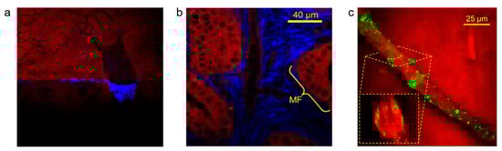 Multimodal imaging of nanoparticle delivery in tissue. (a) Porated skin incubated with deuterated methyl methacrylate nanoparticles. Image contrast derived from coherent anti-Stokes Raman scattering (CH2, 2855 cm−1, red) and stimulated Raman scattering (CD2 nanoparticles, 2120 cm−1, blue). Reproduced with permission from [98], Copyright Elsevier, 2014; (b) Planar cross section through a sample of mouse gall bladder. A mucosal fold (MF) is indicated. Image contrast derived from two photon fluorescence (endogenous fluorophores, red) and second harmonic generation (collagen, blue). Reproduced with permission from [102], Copyright John Wiley and Sons, 2012; (c) Cross-section of a mouse-brain blood vessel following incubation with deuterated quaternary ammonium palmitoyl glycol chitosan nanoparticles. Image contrast derived from epi-detection CARS microscopy of lipid (CH2, 2845 cm−1, red) and nanoparticles (C–D, 2100 cm−1, green). Reproduced with permission from [107]. Copyright Springer Nature, 2016.
