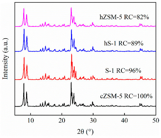 Figure 2 shows the powder XRD patterns of the as-synthesized S-1, hS-1, hZSM-5, and cZSM-5 zeolites. All the samples exhibited the five typical characteristic diffraction peaks at 7.98°, 8.84°, 23.12°, 23.95°, and 24.36°, indicative of the MFI-type zeolites [44]. This meant that the bulk crystal structures of hS-1 and hZSM-5 zeolites were maintained after dissolution-recrystallization process. This result was further confirmed by FT-IR spectra. As shown in Figure S1, all the zeolites showed the framework vibrations at 550 cm−1 and 452 cm−1, which are the characteristic bands of MFI-type zeolites [56]. The significant broad bands at 1230 cm−1, 1110 cm−1, and 800 cm−1 were attributed to the external asymmetric stretch, internal asymmetric stretch, and external symmetric stretch of typical high-silica zeolite [57,58]. Compared with parent S-1 zeolite, the relative crystallinity (RC) of hS-1 and hZSM-5 zeolites decreased by 7% and 14%, respectively, implying that a slight degradation of crystal framework occurred after dissolution-recrystallization treatment. The relative crystallinity of hZSM-5 was lower than that of hS-1, probably because aluminum species retarded the recrystallization of silica species dissolved from the parent S-1 [45]. The 27Al MAS-NMR spectra (Figure S2) of cZSM-5 and hZSM-5 zeolites showed a major resonance at about 53 ppm and a very weak resonance around 0 ppm, corresponding to tetrahedrally coordinated framework aluminum (AlO4) in silica frameworks and octahedrally coordinated non-framework aluminum (AlO6), respectively [54]. This confirmed that the Al species were essentially tetrahedrally coordinated after dissolution-recrystallization treatment.