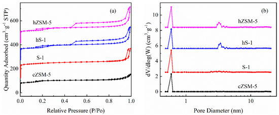 The nitrogen adsorption and desorption isotherms of different zeolites was further characterized and are shown in Figure 3. The hS-1 and hZSM-5 zeolites exhibited a pronounced H4 hysteresis loop at relative pressure P/P0 = 0.45 along with a sub-step around relative pressure P/P0 = 0.2, reflecting the existence of both micropore and mesoporous [59]. This result illustrated the generation of mesoporous in hollow MFI zeolites during TPAOH treatment process. The conventional ZSM-5 showed a type Ⅰ isotherm and no distinct hysteresis loop, which proved that cZSM-5 was a typical microporous zeolite without any mesoporous. The pore size distributions derived from non-local density functional theory (NLDFT) (Figure 3b) further confirmed the existence of micropore and mesoporous in hS-1 and hZSM-5 zeolites. Additionally, the mesoporous size was mainly located around 2–4 nm. The textual properties of various samples derived from N2 physisorption are summarized in Table 1. The cZSM-5 showed a typical specific surface area (SBET, 332 m2·g−1) and pore volume distribution of microporous zeolite. The parent S-1 zeolite had the similar textual structure with cZSM-5 zeolite except more developed micropores. The hS-1 and hZSM-5 zeolites had almost the same pore distribution. Compared with parent S-1, the mesoporous volume (Vmeso) increased by 79% and 80% for hS-1 and hZSM-5 zeolites, respectively. Interestingly, the specific surface area of hS-1 and hZSM-5 had a slightly decreased, while the total volume (Vtotal) determined by t-plot method had no significant change. This could be attributed to the recrystallization leading to a smoother crystal surface and the formation of hierarchical porous hollow structure.