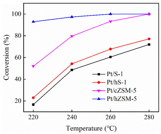 The variation of active metal dispersion on the support was confirmed by CO pulse chemisorption. As shown in Table 2, the CO uptakes of the different catalysts varied from 6.79 to 17.36 μmol·g−1. The metal dispersion of Pt/hS-1 and Pt/hZSM-5 increased significantly, suggesting that the hollow MFI structure promoted the Pt dispersion and more metal active sites were exposed on the surface. Microporous zeolites (S-1 and cZSM-5) are not conducive to the dispersion of metallic Pt. This was consistent with the TEM results (Figure 4).