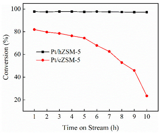 The following are available online at https://www.mdpi.com/2079-4991/9/3/362/s1, Figure S1: FT-IR spectra of cZSM-5, S-1, hS-1 and hZSM-5 zeolites, Figure S2: 27Al NMR spectra of cZSM-5 and hZSM-5 zeolites, Figure S3: TG curves of used Pt/cZSM-5 and Pt/hZSM-5 catalysts after stability tests. Table S1: XPS quantitative data of different Pt catalysts.