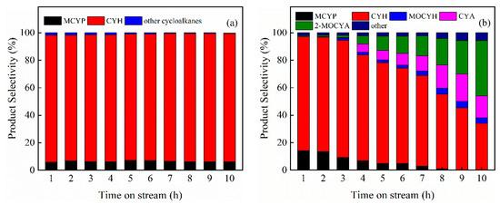 Product selectivity as a function of time on stream over (a) Pt/hZSM-5 and (b) Pt/cZSM-5 catalysts (MCYP: methylcyclopentane, CYH: cyclohexane, MOCYH: methoxycyclohexane, CYA: cyclohexanol, 2-MOCYA: 2-methoxycyclohexanol).