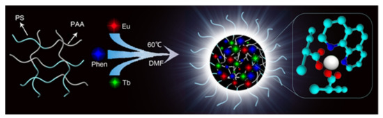 Styrene, acrylic acid, and 1,10-phenanthroline (phen) were purchased from Aladdin (Shanghai, China). Polymerization inhibitor in styrene and acrylic acid were removed before use. 2,2-azobisisobutyronitrile (AIBN) was obtained from Alfa Aesar, and it needed to recrystallize from ethanol. The solvents of dichloromethane, methanol, petroleum ether, and N, N-dimethyl formate (DMF) are analytical solvents that can be used directly. Eu2O3 and Tb4O7 (≥99.9%) were purchased from Shandong Desheng new materials Company Limited. After that, DMF was used as solvent to prepare the Eu3+ and Tb3+ solution, respectively.