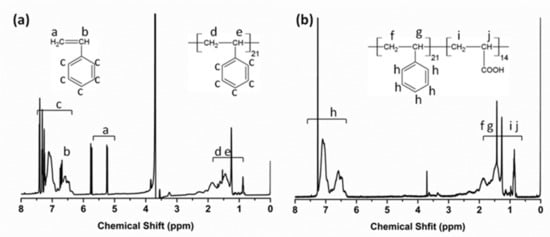 The synthesis of BCPs by RAFT polymerization was based on a previously reported method with sight modifications [29]. Amounts of 1.697 g styrene, 0.192 g RAFT, 0.029 g AIBN, and 5 mL 1,4-dioxane were introduced into a round-bottom flask, and the mixture solution was stirred for 30 min under nitrogen. Then, the mixture solution was heated at 80 °C for 10 h. The 1H NMR spectrum of PS reaction mixture after polymerization is shown in Figure 2a. The PS solid was obtained by using methanol to wash three times. PS was dried under vacuum for 24 h. Amounts of 1.012 g PS, 0.023 g AIBN, 0.641 g acrylic acid (AA), and 10 mL 1,4-dioxane were introduced into a round-bottom flask, then the mixture solution was stirred for 30 min under nitrogen. Finally, the mixture solution was heated at 65 °C for 10 h to prepare the PS-b-PAA solution. The PS-b-PAA solid was obtained to use petroleum ether to wash three times. PS-b-PAA was dried under vacuum at ambient temperature for 24 h. The 1HNMR spectrum of PS21-b-PAA14 is illustrated in Figure 2b.
