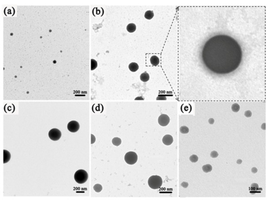 Figure 5 shows different molar ratios of Eu3+ and Tb3+ ions in BCPs-Ln3+-Phen complexes. Eu3+/Tb3+ molar ratios of the samples (a), (b), (c), (d), and (e) are 3:1, 2:1, 1:1, 1:2, and 1:3, respectively. The average size of these micelles structures are: (a) 40–80 nm, (b) 130–170 nm, (c) 280–350 nm, (d) 100–200 nm, and (e) 50–100 nm. The sizes of micelles in samples (a) and (e) are much smaller, but that in sample (c) is much bigger. The influence of sample composition on micelle sizes can be ascribed to the different contents of Ln3+ ions. With the increase of Ln3+ ions, more Ln3+ ions take part in the coordination and the cross-linking densities among the different PAA segments increases. Therefore, the micelles become tighter, which makes the size smaller.