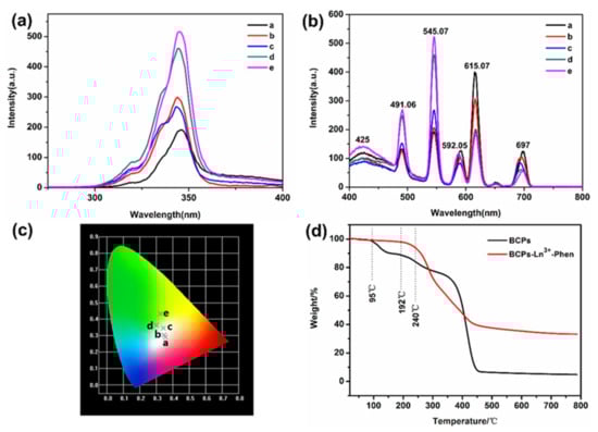 Fluorescence property, white light performance, and thermal stability of BCPs-Ln3+-Phen (a) Excitation spectra and (b) emission spectra of samples containing different molar ratio of Ln3+ ions, Eu3+/Tb3+ = 3:1 Eu3+/Tb3+ = 2:1, Eu3+/Tb3+ = 1:1, Eu3+/Tb3+ = 1:2, Eu3+/Tb3+ = 1:3, (λex = 340 nm). (c) The CIE chromaticity coordinates of complexes a–e excited by 340 nm [a (0.355, 0.290), b (0.347, 0.303), c (0.342, 0.346), d (0.300, 0.363), e (0.326, 0.432)]. (d) TG curves of BCPs and BCPs-Ln3+-Phen.