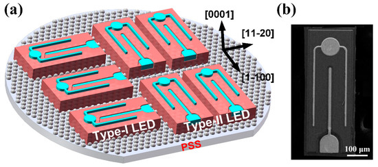 In this work, we kept the size of device area at 712 μm × 254 μm unchanged, while the chip sidewall orientation was varied as shown in Figure 1. We named the two types of LEDs as Type-I LED and Type-II LED, respectively. The larger sidewalls of Type-I LED were set to be parallel to the a-plane of sapphire substrate while the larger sidewalls of Type-II LED were set to be perpendicular to the a-plane of sapphire substrate.