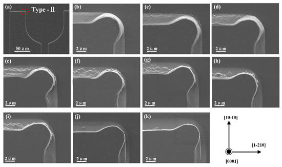 The morphologies of epitaxial layers with different TMAH etching time were investigated with a TESCAN MIRA 3 LMH field emission scanning electron microscope (SEM, TESCAN, Brno, Czech Republic). As shown in Figure 2a, the marked corner was chosen to show the morphology change after TMAH etching for the reason that the corner structure presented more morphology information with three perpendicular sidewalls. Within the investigated TMAH etching time, trigonal prism structures were observed on the sidewall along the [1–210] direction (with the exposed m-plane), while no such structure appeared on the top surface of p-GaN (with the exposed + c-plane) and the sidewall along the [1–100] direction (with the exposed a-plane). This phenomenon indicated that the TMAH solution possesses different etching ability to the exposed crystallographic plane. The TMAH etching starts with the attachment of hydroxide ions to the positively-charged Ga dangling bonds, while adjacent negatively-charged N dangling bonds would prohibit the hydroxide ions from accessing Ga atom. Thus, the density of N dangling bonds on each crystallographic plane determines the etching ability of TMAH solution. As previously reported, the density of N dangling bonds can be ranked as follows: +c-plane > a-plane > m-plane [26]. The calculated density of N dangling bonds suggested that TMAH has the largest etching ability to m-plane among the three listed crystallographic planes, which may explain why the TMAH etching did not occur on the top surface of p-GaN and a-plane sidewall. The size and density of trigonal prisms on the m-plane sidewall varied with different TMAH etching time. With a short TMAH etching time of 1 min, miniature prisms formed throughout the m-plane sidewall of n-GaN as shown in Figure 2c. Increasing the TMAH etching time led to the coalescence of miniature prisms to generate larger trigonal prisms (Figure 2d–f). However, the density of trigonal prisms decreased with increasing TMAH etching time when the TMAH etching time was over 7.5 min (Figure 2g,j). A TMAH etching treatment of 40 min finally led to the disappearance of trigonal prism (Figure 2k). It was proposed that the density of trigonal prisms is first–order inversely proportional to the etching time for a given etchant concentration and temperature owing to that the wet chemical etching was demonstrated a first-order reaction [28,32], which means that the etching rate is also inversely proportional to the density of prisms. According to the Arrhenius equation: