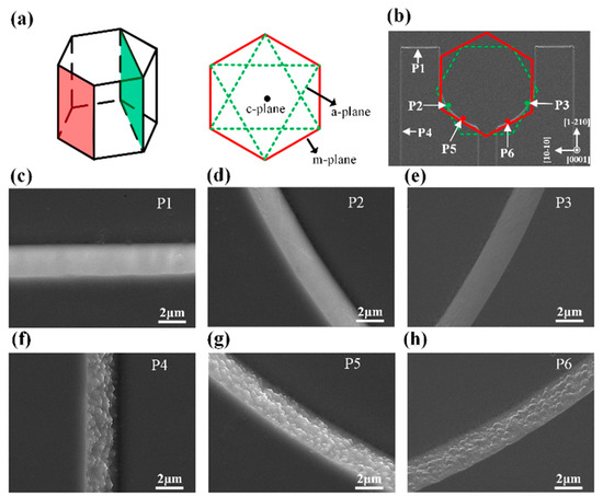 (a) Schematic of the wurtzite structure GaN unit cell and its projection in the c-plane. (b) SEM images of Type-I LED chips, the projection was incorporated to show the exposed m-plane and a-plane. (c–h) The SEM images at marked positions: (c) P1; (d) P2; (e) P3; (f) P4; (g) P5; and (h) P6.