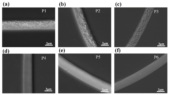 (a–f) SEM images of selected areas of Type-II LED chips, (a) P1; (b) P2; (c) P3; (d) P4; (e) P5; and (f) P6. The six regions were chosen at the same position as they were in the Type-I LED chips.