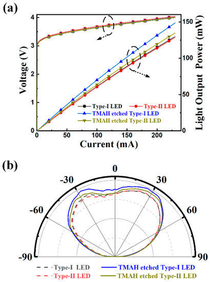 Figure 6a showed the L-I-V characteristics of the two types of LEDs with and without TMAH treatment. Without TMAH etching treatment, the investigated two types of LEDs showed almost the same electrical characteristic. After TMAH etching treatment, both of the two types of LEDs showed a 0.3 V decrease in forward voltage. The decreased forward voltage was due to better ohmic contacts between ITO transparent conductive electrode and p-GaN in the TMAH etched LED chips. The TMAH etching process can eliminate the oxide on the p-GaN surface and improve the carrier density near the p-GaN surface as previously reported [30], which are beneficial for the improvement of ohmic contact. With injection current of 60 mA, the light output powers for the TMAH etched type-I LED and TMAH etched Type-II LED were 42.99 mW and 39.13 mW, which were improved by 15% and 5% as compared to the un-etched LED. Although it has been reported that TMAH etching effectively improve the LED performance [30,33], it is unaware that the orientations of LED chip sidewalls play a significant role in the etching process. It is noteworthy that the TMAH etching process created reversed rough sidewalls for the two types of LED chips in our experiments. For the cuboid geometry chips as shown in Figure 1, Type-I LED chips possess larger rough sidewalls than that of Type-II LED chips after the TMAH etching process. The textured surfaces created by wet chemical etching can efficiently improve the opportunities that photons incident into the escape cone, leading to an increase in light extraction efficiency. Figure 6b shows the far-field radiation profiles of the investigated LEDs measured at the injection current of 50 mA. Compared to the unetched LEDs, the TMAH etched LEDs exhibited an enhanced emission intensity in the ±[15°, 60°] direction, suggesting that more photons escaped from sidewall. The TMAH etched Type-I LED had the strongest emission intensity among the investigated LEDs, demonstrating that larger textured sidewall is beneficial for light extraction.
