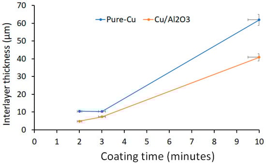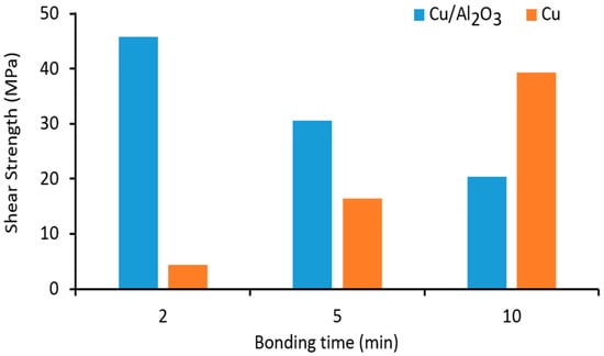 Shear strength measurements as a function of bonding time using Cu/Al2O3 and pure-Cu interlayers.