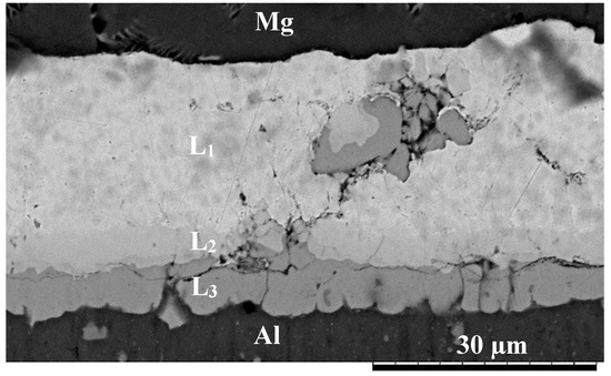 During the first stage of the bonding process, interfacial contact was achieved due to the application of an external static load which presses that sample together during the heating stage. Deformation of the surface asperities during the heating stage ensures intimate contact of the bonding surfaces. As the temperature of the samples increased, interdiffusion at the Mg/interlayer and Al/interlayer interface results in the formation of three reaction layers as shown in Figure 2. EDS analysis revealed that L1 is Cu containing dispersed Al2O3 nanoparticles. L2, on the other hand, appears to be a copper aluminide intermetallic with composition 34.78 (wt%) Al and 41.68 (wt%) Cu while L3 had a composition 42.19 (wt%) Cu and 56.68 (wt%) Al. According to the Al–Cu phase diagram, the L3 phase is likely to be Cu2Al intermetallic compound [16].