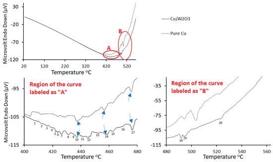 Thermogravimetric analytical curves of the Mg/Cu/Al and Al/Cu-Al2O3/Mg joints. The analysis was performed in nitrogen having a flow rate of 40 mL/min and a heating rate of 10 °C/min.