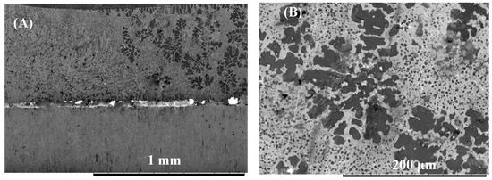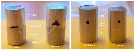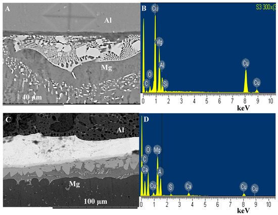 (A) SEM micrograph of the Mg/Al bonded for 2 min using Cu interlayer. (B) Mg/Al bonded for 5 min using pure-Cu interlayer.