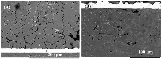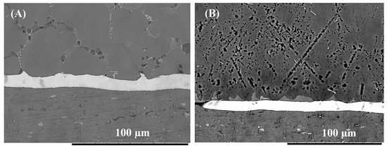 The difference in the volume of eutectic liquid formed during bonding was also evident on the shear stress samples shown in Figure 14. When the shear force was applied during bonding, some of the eutectic liquid squeezed out when the Cu/Al2O3 interlayer was used, leaving cavities in the joint affected regions as shown in Figure 14A. When compared to samples bonded using pure-Cu interlayer (see Figure 14B), liquid squeeze-out was prevented, since a smaller volume of liquid was formed. If the thickness of the Cu/Al2O3 interlayer is reduced, the volume of liquid formed during bonding can be reduced which would prevent cavities from forming during bonding [19]. Additionally, since large external pressure is not required for diffusion brazing, a lower applied load during bonding could also prevent expulsion of the eutectic liquid.