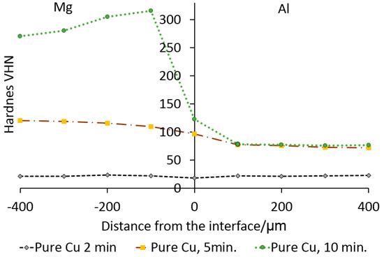 Micro-hardness profile for Mg/Al bonds as a function of bonding time using pure Cu interlayer.