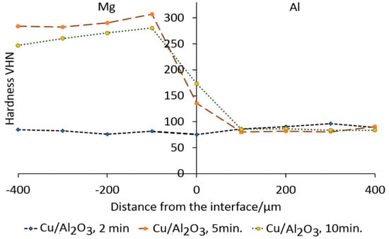 Micro-hardness profile for Mg/Al bonds as a function of bonding time using Cu/Al2O3 interlayer.