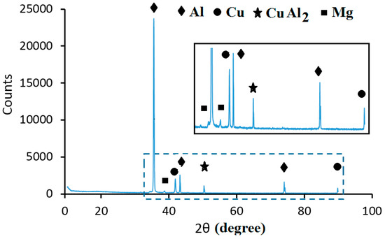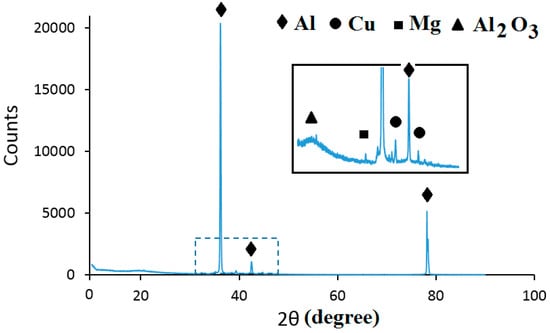 The fracture surface of a bond made using Cu/Al2O3 interlayer for 2 min is shown in Figure 15. The fracture surface was characterized by an acicular structure with angular cleavage planes typical of transgranular fracture. The undulating nature of the surface and the large ridges formed suggest that the fracture propagated through the joint region adjacent to the bond-line at the Al interface. The presence of small grains at the interface is believed to be responsible for the high strength recorded. The XRD analysis of the fracture surface presented in Figure 16 confirmed that intermetallic compounds were not formed when a bonding time of 2 min was used.