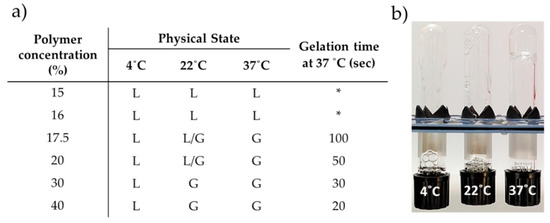 Hydrogel physical characterization. (a) Tube inversion test and in vitro gelation time form 22 °C to 37 °C for 2 mL HG volume. (b) Tube inversion test photos for the 20% w/v HG. * No gelation was obtained during the experiment time (24 h). L-Liquid, G-Gel, L/G-more viscous liquid.