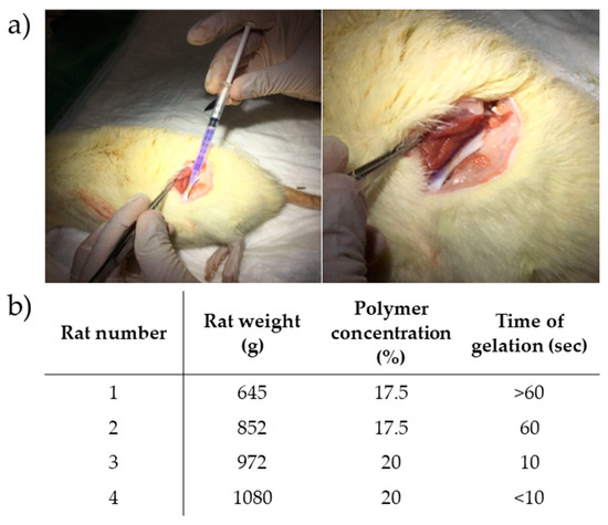 Gelation time post mortem in a rat pilot model. (a) Gelation allows the HG to remain at the spot of injection post mortem (violet circle), (b) Rat weight in grams, HG concentration polymer in percentage, and correspondent gelation time in seconds.