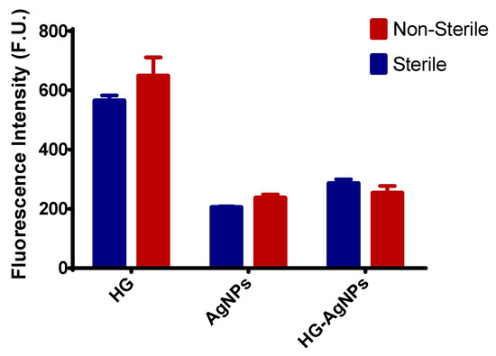 The efficacy assay in Staphylococcus aureus showed that HG-AgNPs have similar antibacterial activity as free AgNPs, presenting both a significant reduction of CFU/mL when compared with the empty HG (p < 0.001). In addition, no statistically significant differences (p > 0.05) between the activity of sterilized and non-sterilized HG was observed. Thus, the activity of both, HG-AgNPs and AgNPs, is not affected during the sterilization process.