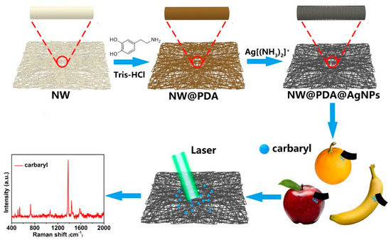 Inspired by these distinctive advantages of PDA molecules, in this work, a simple and versatile approach was exploited to fabricate flexible SERS substrates for highly sensitive carbaryl detection by AgNPs in-situ grown onto the NW fabric surfaces. By regulating the reaction time between catechol groups and [Ag(NH3)2]+ ions, a controllable density of AgNPs was in-situ grown onto the surfaces of NW fabrics. These NW@PDA@AgNPs fabrics exhibited high sensitivity and superior reproducibility, and the detection concentration limit was as low as to 1.0 × 10−12 M toward crystal violet (CV) molecules. More importantly, these NW@PDA@AgNPs fabrics could be directly utilized for conformal SERS detection of carbaryl pesticides from complex surfaces through a simple swabbing approach, and achieved a high sensitivity and superior reliability. It was identified that the detection limit of carbaryl residues from apples, oranges, and bananas approximately decreased to 4.02 × 10−12, 6.04 × 10−12, and 5.03 × 10−12 g, respectively. These NW@PDA@AgNPs fabrics could not only drastically increase the sample collection efficiency, but also be used as flexible SERS substrates for real sample detection with negligible pretreatment. The fabrication approach would demonstrate enormous potential to construct versatile SERS substrates for highly sensitive and reliable detection of traces of carbaryl pesticide residues in the agriculture, environment, and bioscience fields.