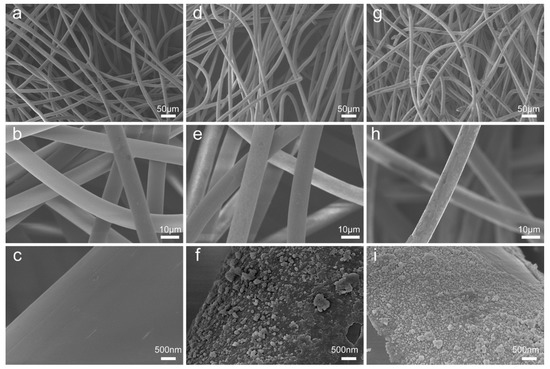 Figure 2. SEM images of the pristine non-woven (NW) fabrics (ac), non-woven polydopamine (NW@PDA) fabrics (df), and NW@PDA@AgNPs fabrics (gi).