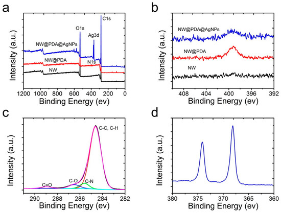 Figure 3. (a) X-ray photoelectron spectroscopy (XPS) survey of the pristine NW, NW@PDA, and NW@PDA@AgNPs fabrics. (b) The changes of N1s spectra in the pristine NW, NW@PDA, and NW@PDA@AgNPs fabrics. (c) Narrow-scan XPS spectra of C1s in NW@PDA@AgNPs fabrics. (d) High-resolution spectrum of Ag3d in NW@PDA@AgNPs fabrics.