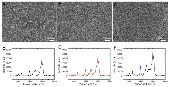 The AgNP morphologies of NW@PDA@AgNPs fabrics were extremely crucial to obtain highly sensitive and reliable SERS detection of trace carbaryl pesticides. In order to obtain the highest SERS signal intensities, the AgNP morphologies were regulated by controlling the immersion time of NW@PDA fabrics in the [Ag(NH3)2]+ solution. As shown in Figure 4a, AgNPs were gradually formed and randomly distributed on the NW@PDA@AgNPs fabrics at the initial time, and the sizes of the AgNPs were in the range of 30–60 nm. With the increase of immersion time, the amount of AgNPs gradually grew larger on the NW@PDA@AgNPs fabrics with more [Ag(NH3)2]+ cations turning into AgNPs through the in-situ reduction, and consequently, more nanogaps were formed among the AgNPs (Figure 4b). As the immersion time further increased to 12 h, the AgNPs tended to pack together, resulting more interstices and nanogaps between adjacent AgNPs.