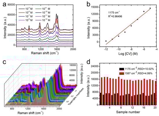 Figure 5. (a) SERS spectra of CV at different concentrations on the NW@PDA@AgNPs fabrics. (b) The calibration curve of characteristic peak intensity at 1175 cm−1 with the logarithm values of sample concentration. (c) The stability of SERS substrate from 20 random points probed with CV molecules. (d) Intensity distribution of CV at 1175 and 1587 cm−1, collected from 20 different NW@PDA@AgNPs fabrics.