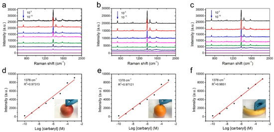 Swabbing the surfaces with a versatile and flexible SERS substrate is a highly efficient and practical method that could greatly enhance the sample collection from a real-world surface. To confirm the applicability of NW@PDA@AgNPs fabrics for collecting the carbaryl residues from the surfaces of various fruits, the carbaryl pesticide was dissolved in alcohol and diluted to different concentrations in the range of 1 × 10−3 to 1 × 10−10 M. The diluted carbaryl pesticides were sequentially sprayed on the surfaces of apples, oranges, and bananas, and then these surfaces were dried at room temperature. The fabricated NW@PDA@AgNPs fabrics were used as flexible substrates to collect the residues of carbaryl pesticides by the surface swabbing method, and the residues were detected on a Renishaw inVia9 Raman Microscope with a 532 nm laser irradiation. From Figure 6a–c, the representative peaks located at 729, 1378, 1436, and 1577 cm−1 obviously appeared, and were well in accordance with the related reports for carbaryl pesticide SERS detection [19].