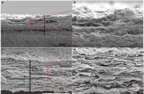 Cross section of the prepared membrane with different volume dispersion. (a,b) 6 mL dispersion. (c,d) 12 mL dispersion.