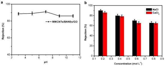 In order to determine the performance of the membrane in environments such as acidic, alkaline or saline conditions, a series of experiments were performed by adjusting the pH of the TCH solution or adding salt into it. Figure 8a shows the influence of pH value on the rejection of TCH, and it was found that the performance of the membrane declined slightly in alkaline solution compared with acid or neutral solutions. A possible reason for this is that the hydrochloric in TCH dissociated and reacted with the alkali, then producing salt which made the environment harsher and reduced membrane performance. Although the rejection in alkaline condition declined, it still reached 86.1%. Figure 8b shows the effect of different salt concentrations on the membrane performance. It can be seen that the higher the salt concentrations, the lower the membrane performance. This result demonstrated that salts induce a harsher environment when the membrane intercepts TCH from solution. As the color of the TCH solution changed due to the addition of alkaline or salt, reactions may have occurred in the solution. The color of TCH solution was clear and transparent after filtration. It is very likely that electrostatic interactions occurred between metal cations and negatively charged BNNSs, and these electrostatic interactions partly destroyed the interaction between GO and BNNSs, resulting in a decline in membrane performance. However, the membrane was still stable in a salts solution and had a blocking effect on saline ions.