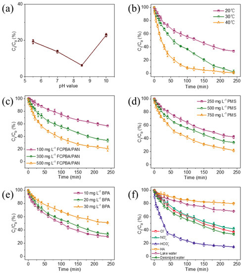 Effects of (a) different initial pH, (b) reaction system temperatures, (c) catalyst dosages, (d) PMS dosages, (e) BPA concentrations, and (f) ions and organics on the BPA removal efficiency. Reaction conditions: BPA solution = 20 mg·L−1 (for a, b, c, d, and f); PMS = 500 mg·L−1 (for a, b, c, e, and f); FCPBA/PAN = 233 mg·L−1 (for a, b, d, e, and f); T = 293 K (for a, c, d, e, and f); initial solution pH = 2.8 (for b, c, d, e, and f).