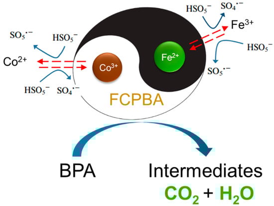Firstly, Co2+ and Fe2+ can be oxidized during the activation of PMS to generate SO4•−. Meanwhile, Co3+ and Fe3+ can react with SO5•− to regenerate Co2+ and Fe2+. Additionally, SO4•− derived from PMS can induce the formation of •OH (Equation (7)):