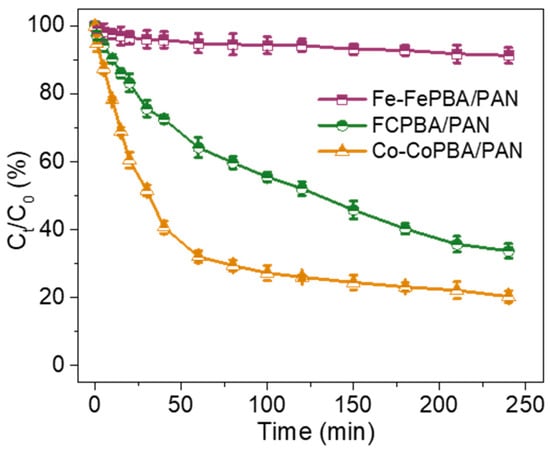 Degradation of BPA was chosen to investigate the performance of catalysts and the results were shown in Figure 3. When FCPBA/PAN was added to BPA solution without the addition of PMS, less than 3% of BPA was removed by static adsorption after 240 min, which demonstrated that the adsorption of FCPBA/PAN was very weak. Meanwhile, using only PMS showed a degradation of less than 5%, suggesting that active radicals could hardly be generated by PMS alone. When the pure PAN nanofiber and 0.6FC/PAN were added into the BPA solution which contained 500 mg/L of PMS, only 5% and 40% of BPA was degraded after 240 min. As a comparison, FCPBA/PAN and FCPBA nanoparticles were conducted at the same condition and reached a higher removal efficiency of 67% and 79%, respectively, indicating that more active sites exposed to reaction system could contribute to the catalytic performance. Total organic carbon (TOC) of BPA was also tested and result was shown in Figure 4. About 65% of BPA was degraded to CO2 and H2O after 240 min, this result was caused by some degradation intermediates that were hard to be degraded, which was close to the previous report [37,41]. The particle stability was tested by dropping FCPBA into reaction solution for 4 h. XRD result showed that the structure of FCPBA still maintained well after catalyzation (Figure S2c).