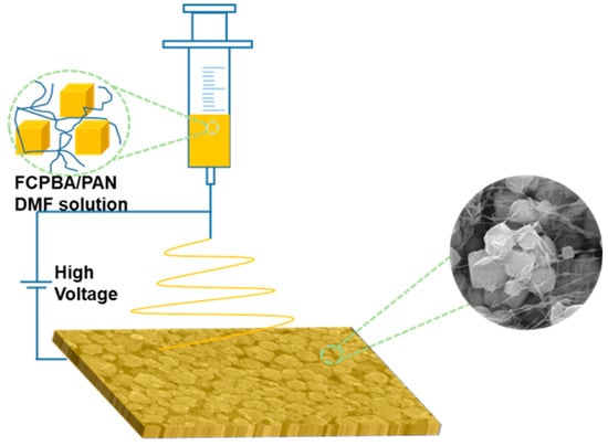Illustration of the preparation process of the Fe-Co Prussian blue analogue/polyacrylonitrile (FCPBA/PAN) nanofibers.