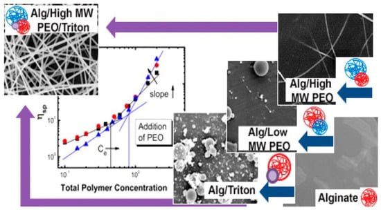Sodium alginate based nanofibers were also synthesized using polyethylene oxide (PEO) as “carrier polymer” [121]. It was concluded from the study that the sodium alginate on its own could not be electrospun. However, with the addition of a suitable polymer, it can be easily electrospun [121] and the PEO–PEO interactions with high molecular-weight entangled PEO were the key to “carrying” the alginate from the prepared solution to synthesise the fibers using electrospinning (Figure 4).