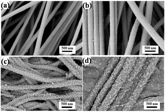 SEM images of (a) as-electrospun Na-alginate nanofibers and (b–d) Ag/alginate nanofibers obtained at different reduction times: (b) 10, (c) 20, and (d) 30 min. Reprinted with permission from Ref. [124]. Copyright American Chemical Society, 2018.
