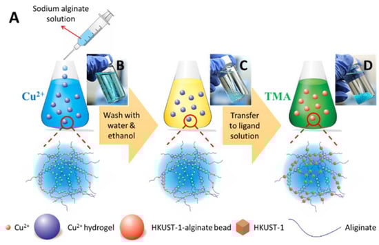 (A) Schematic of the preparation of the MOF–alginate composite. Photographs of (B) alginate hydrogels cross-linked by Cu2+ right after the addition of a sodium alginate aqueous solution to a Cu2+ aqueous solution, (C) alginate hydrogels cross-linked by Cu2+ after being washed with water and ethanol, and (D) HKUST-1–alginate hydrogels [159]. Reprinted with permission from Ref. [159]. Copyright American Chemical Society, 2016.