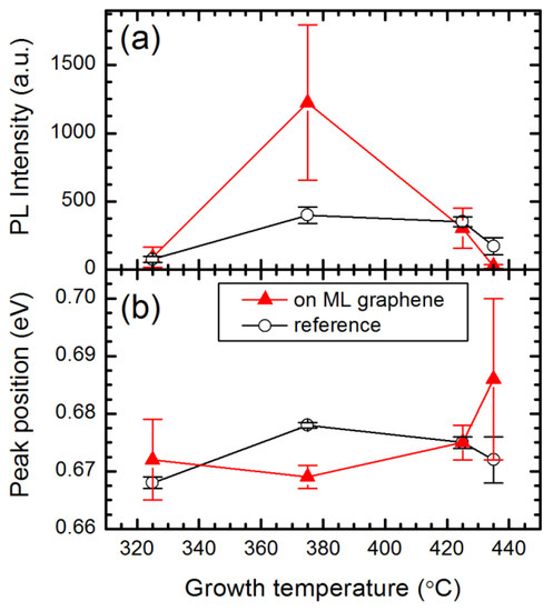 Average PL intensity (a) and peak position (b) of InN layers grown at different temperatures. PL parameters from the areas on ML graphene (red triangles) and outside ML graphene (open circles) are compared.