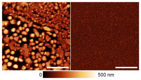AFM images of InN layer deposited at 425 °C on ML graphene without (left) and with an aluminum nitride (AlN) interlayer (right). White scale bar is 3 µm.