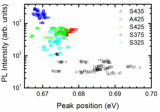 A high density of unintentional donors and, consequently, strong filling of the conduction band resulting in a high-energy shift of the optical band gap is an inherent property of InN. Therefore, we studied the correlation of PL intensity and band peak position. In each sample, we selected regions of 0.6 × 0.6 µm² in size at the center of several bright spots, and extracted the PL intensity and the band peak position spatially-integrated within the regions. The pairs of the PL intensity/peak position values for each region in the five samples studied are represented as points in Figure 6. The results reveal a general trend: The samples exhibiting lower-energy PL peak position emits at a higher efficiency. Moreover, the higher is the peak position, the larger are the distributions of the PL peak position, the band width, and the emission intensity in the bright spots of the InN layers.