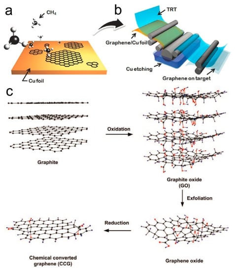 Schematics of the synthesis mechanism of chemical vapor deposition (CVD) graphene on Cu foil (a) and the roll-to-roll transfer process of graphene (b). Reproduced with permission from [42]. Copyright Wiley-VCH, 2016. Schematic of the preparation of graphene oxide and reduced graphene oxide by the reduction of graphene oxide (c). Reproduced with permission from [63]. Copyright Wiley-VCH, 2011.