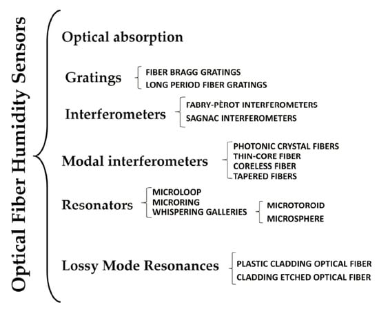 Optical fiber humidity sensors detect changes of the optical properties inside the fiber caused by water molecules, such as changes of the transmitted optical power, dielectric properties, or the refractive index. Compared to electronic humidity sensors, optical fiber humidity sensors show several advantages, such as the possibility of working in harsh conditions, including flammable environments; higher temperature and pressure ranges; and electromagnetic immunity. However, some facts, including the fabrication repeatability and the high cost of the optical equipment, have prevented the commercial applications of optical fiber humidity sensors. According to the working principle, optical fiber humidity sensors can be classified into several groups, such as humidity sensors based on the optical absorption of materials; humidity sensors based on fiber Bragg gratings and long-period fiber gratings; humidity sensors based on interference (Fabry-Pérot, Sagnac, Mach-Zehnder, Michelson, and modal interferometers); humidity sensors based on micro-tapers, micro-ring, micro-knot resonators, and whispering galleries modes; and humidity sensors based on electromagnetic resonances, specifically lossy mode resonances [98]. The classification is shown in Figure 6. More details can be found in a comprehensive and specialized review on optical fiber humidity sensors summarized by Ascorbe et al. [98], thus this review will not describe the detailed mechanisms.