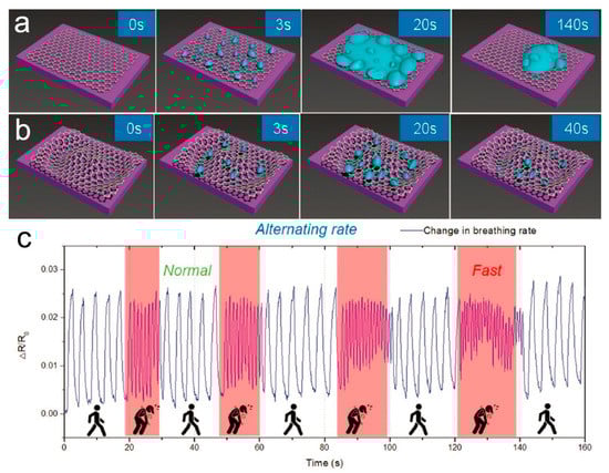 Schematic illustration of the water adsorption and desorption on surfaces of CVD-growth flat graphene (a) and wrinkled graphene (b), and breathing signals recorded by wrinkled graphene sensors with alternating breathing speed and depth during physical activity (c). Reproduced with permission from [113], Copyright Wiley-VCH, 2018.