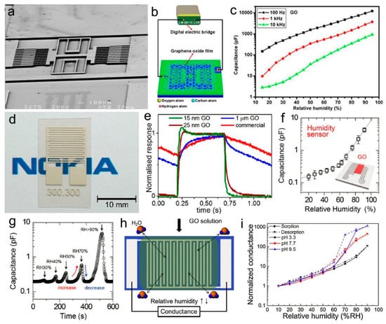Humidity sensors based on GO materials have been widely studied due to the simple, low-cost, and large-scale preparation of GO, and high proton-conductive sensitivity to water molecules. Based on the change of the proton conductivity, GO humidity sensors generally operate by detecting the capacitance or impedance signals [116,117]. Bi et al. constructed a GO humidity sensor by depositing a GO film on microscale interdigitated electrodes (Figure 9a), the capacitance change of which towards humidity was measured with an LCR meter (Figure 9b) [76]. The capacitance of the humidity sensor was related with the relative humidity in the gas environment, as well as the frequency (Figure 9c). This device exhibited a highly improved sensitivity at 15–95% compared to conventional capacitive humidity sensors, and a fast response time of 10.5 s and recovery time of 41 s. Subsequently, Borini et al. investigated the influence of the GO layer thickness on the response of the humidity sensor and demonstrated that a thickness of 15 nm of the GO film resulted in an ultrafast response to a modulated humid flow at the tens-of-microseconds scale while maintaining a full scale output of over an order of magnitude (Figure 9d,e) [76]. Ho et al. reported a stretchable and multimodal all graphene electronic skin by spray coating rGO or GO on a patterned CVD graphene on poly(dimethylsiloxane) (PDMS) to realize different functions, where the device made of GO on the graphene structure worked in a capacitive mode and showed a response to the humidity change (Figure 9f,g) [118]. Recently, Park et al. investigated the correlation between the sensitivity and the sorption/desorption hysteresis of thin film GO humidity sensors working in the conductance mode (Figure 9h), which indicated that the sensors made at pH 3.3 showed a lower sensitivity and hysteresis-induced error while those made at pH 9.5 showed both increased sensitivity and hysteresis-induced error (Figure 9i) [119]. They proposed that the enhanced sensitivity and the hysteresis of these sensors were based on the molecular interactions between the increased water and charged groups in GO at high pH, suggesting a trade-off relationship between sensitivity and hysteresis. In addition, various approaches have been employed to improve the sensing performance or application area of GO based humidity sensors, such as free-standing GO foam to increase the active site [120], ultralarge GO to improve the overall proton conductivity [121], silk fiber coated with GO to take advantage of silk fiber’s flexibility [122], computer-aided design [123], investigation of the influence of the structure and coating methods [124], heteroatom-doping on GO to improve the response [125], as well as microstructure related synergic sensing for high-performance humidity sensors [126].